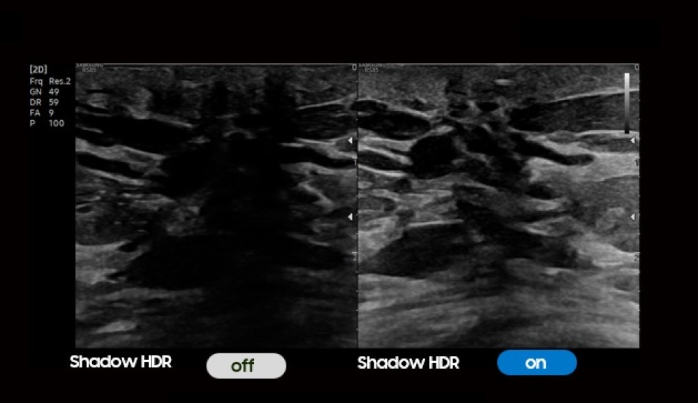 ShadowHDR™: Akustik kölgələnməni azaldaraq kontrast rezolyusiyasını artırır, qabırğa, sümüklər və kalsifikasiya arxasında daha yaxşı vizualizasiya təmin edir.